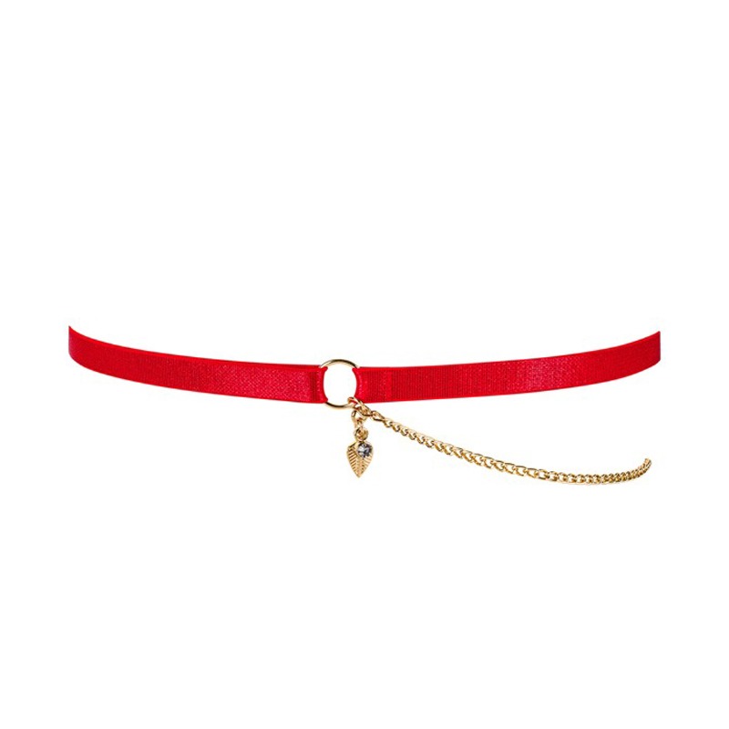 Rotes schmales Strumpfband Ingridia der Marke Obsessive mit goldfarbenem Kettchen und einem kleinem, herzförmigen Schmuckanhänger. Weich und elastisch sowie verstellbar für rutschfesten Sitz.