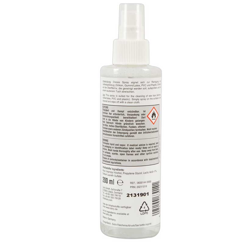 Veganes Reinigungsspray für hygienisch sauberes Erotikspielzeug. Anwendbar mit Materialien aus Gummi/Latex, Silikon, PVC und Plastik. Eiweißlösend.
